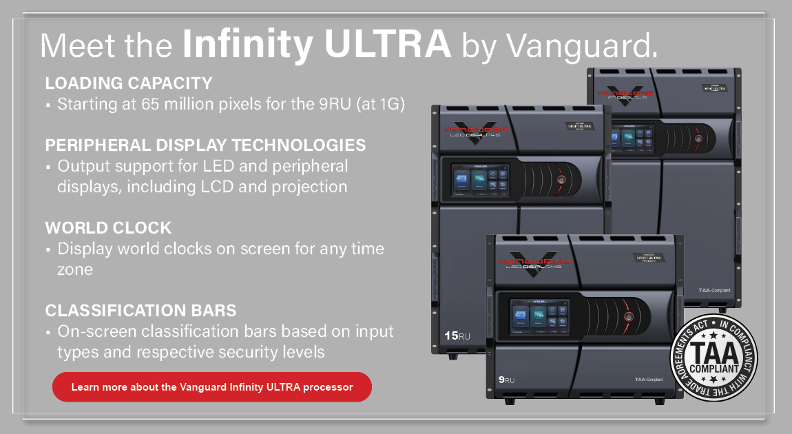 Vanguard offers the broadest range of leading-edge indoor and outdoor LED displays. These include very fine pixel pitches starting at P0.6, Chip On Board, Epoxy Resin, XR Studio, All-In- One, Transparent, Roll-Up Displays, Flex, 3D, and the ground-breaking Infinity Control System.