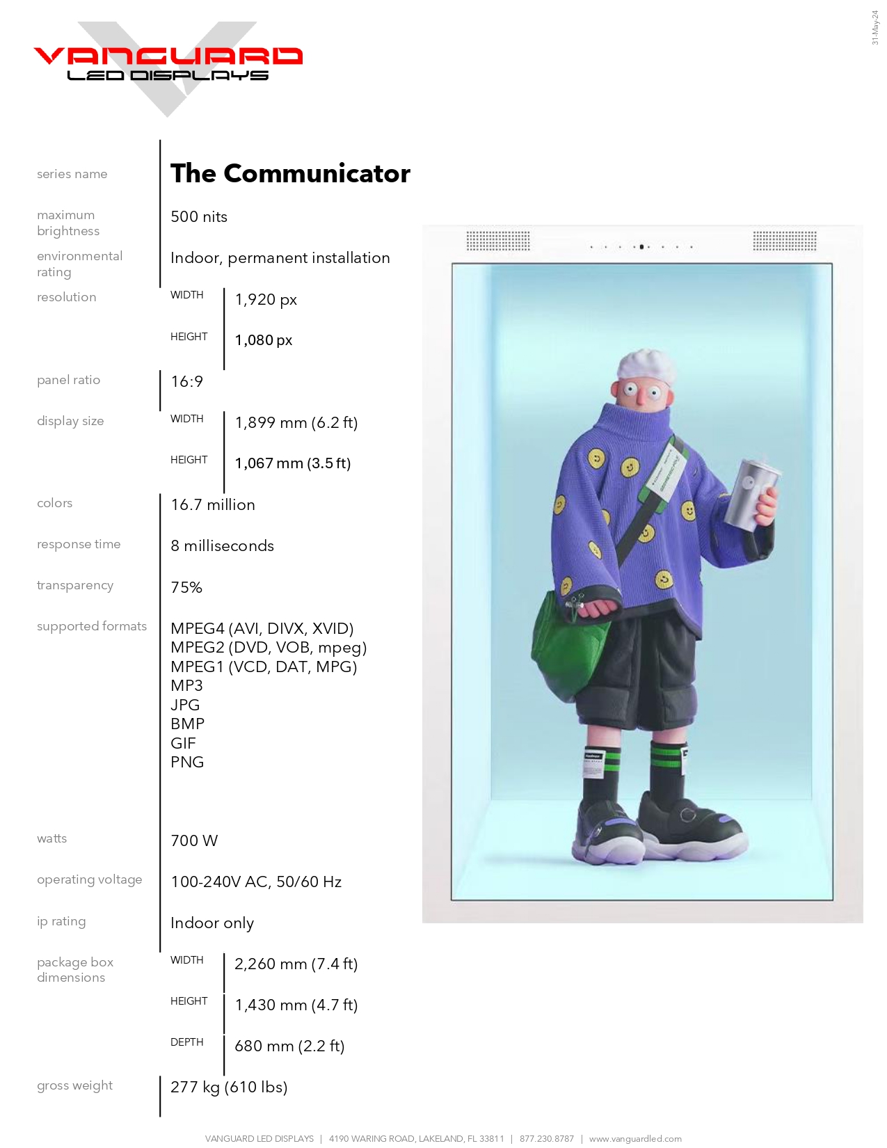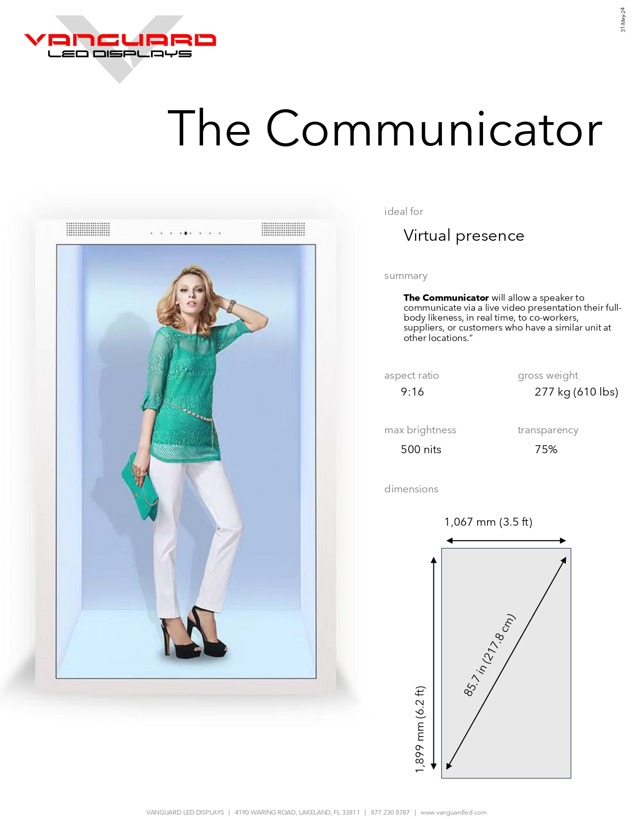 The Communicator will allow a speaker to communicate via a live video presentation their fullbody likeness, in real time, to co-workers, suppliers, or customers who have a similar unit at other locations.”