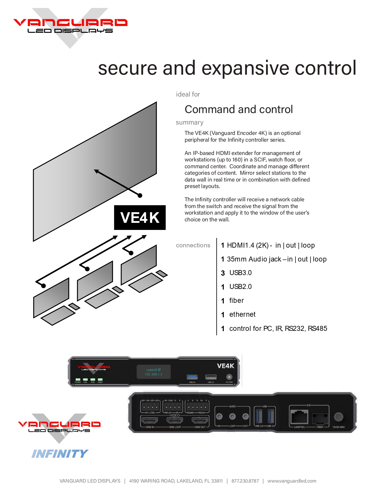 Infinity controllers can also be paired with the Vanguard LED VE4K encoder to enable dynamic screen sharing from a high volume of connected machines.