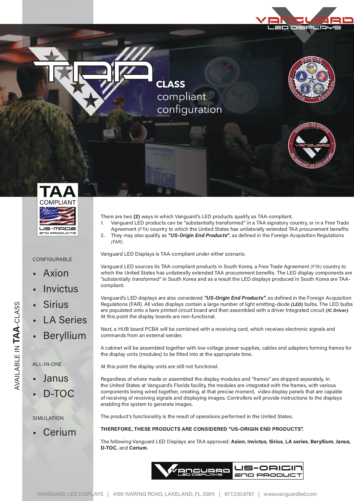 At Vanguard LED Displays, Inc., we stand as the only company in America proudly published in the Federal Register as TAA-approved. This prestigious approval means Vanguard is uniquely authorized to sell to any agency of the U.S. government, reflecting our unwavering commitment to quality and compliance.